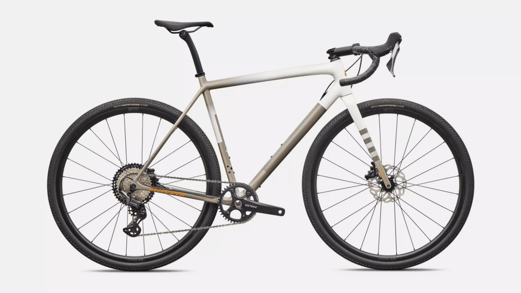 The Specialized Crux is the more conventional race gravel bike. A lightweight carbon frame, aggressive geometry, wide tyre clearance, and a race-ready component spec make it a pure performance tool — fast on flat gravel, capable on climbs, and predictable at pace. It is what a race gravel bike should be without any conceptual eccentricity.